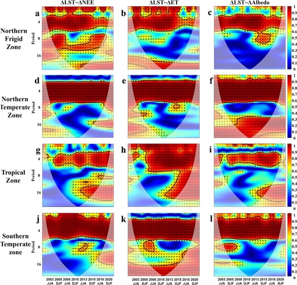 余兆武团队通过20年的卫星观测数据,在全球尺度上量化了森林对地表温度的影响模式及驱动因素,为系统理解全球森林的局地降温效应提供了认识。主研究发现如下:1. 全球森林局地气候效应的气候带差异显著:北方森林全年呈现显著增温效应(+1.99°C),主要由夜间增温驱动,与净生态系统交换(NEE)和蒸腾(ET)路径密切相关。温带森林白天降温效应显著(北半球-0.48°C,南半球-0.91°C),但冬季转为增温,降温主要依赖碳汇(NEE)路径。热带森林全年稳定降温(-2.11°C),主要由蒸腾作用主导,且近20年效应波动极小。2. 长期趋势与机制解析。2001—2021年间,北方森林增温效应以每年+0.03°C的速率缓慢增强,可能与气候变暖加剧干旱有关;而热带森林的降温效应则保持高度稳定。生物物理(蒸腾、反照率)与生物地球化学(碳汇)路径的协同作用,是森林调控温度的关键。增强的蒸腾与反照率可同步放大降温效应,而碳汇减少则对局地降温具有非同步但显著的全球尺度影响。3. 跨尺度验证。通过小波相干分析,研究发现森林的温度调控效应与关键环境变量(NEE、ET、反照率)在年际尺度上存在强关联,进一步验证了多路径协同作用的时空规律。该研究首次整合了全球森林的温度调控效应及其驱动机制,揭示了不同气候带森林管理的优先级。