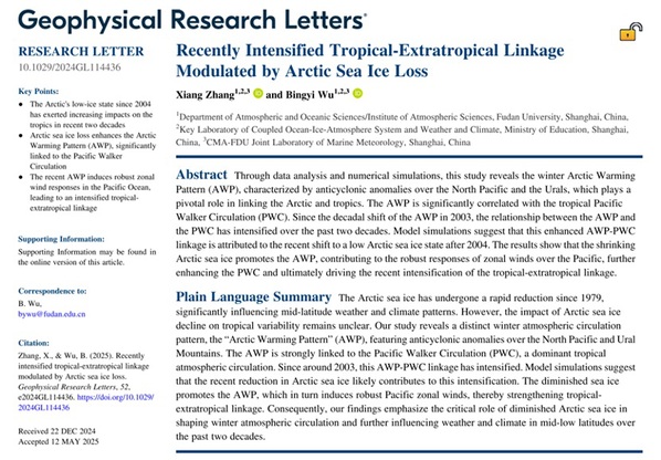 5月21日,大气与海洋科学系武炳义教授课题组揭示了过去二十年北极海冰的年代际减少可以影响北半球冬季大气环流,进而影响中低纬度气候变率。该研究基于再分析数据和数值模拟敏感性试验,系统地分析了2004年以来北极海冰年代际消融如何增强热带与北极间的联系,为理解全球变暖背景下北极与热带之间复杂的相互作用提供了崭新的视角和科学依据。相关成果以“Recently intensified tropical‐extratropical linkage modulated by Arctic sea ice loss”为题发表于Geophysical Research Letters期刊上。