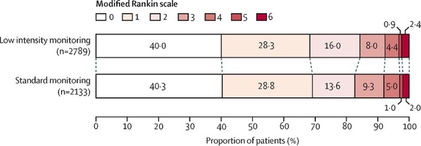 低强度监测组和标准监测组 90 天后 mRS 评分的原始分布情况