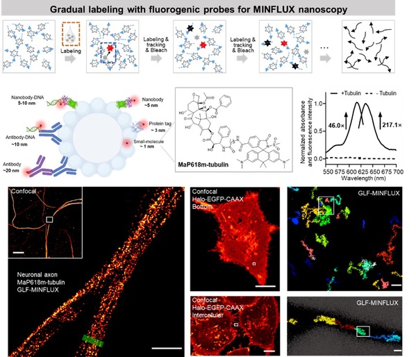 5月21日,药学院王璐课题组、光科学与工程系马炯研究员团队及其合作者报道了一种新型超分辨单分子成像技术——GLF-MINFLUX(Gradual Labeling with Fluorogenic Probes for MINFLUX),突破了复杂细胞环境下成像精度与标记密度的双重瓶颈,实现药靶蛋白时空分布的可视化解析。相关成果以“Gradual labeling with fluorogenic probes: A general method for MINFLUX imaging and tracking”为题发表于Science Advances期刊上。
