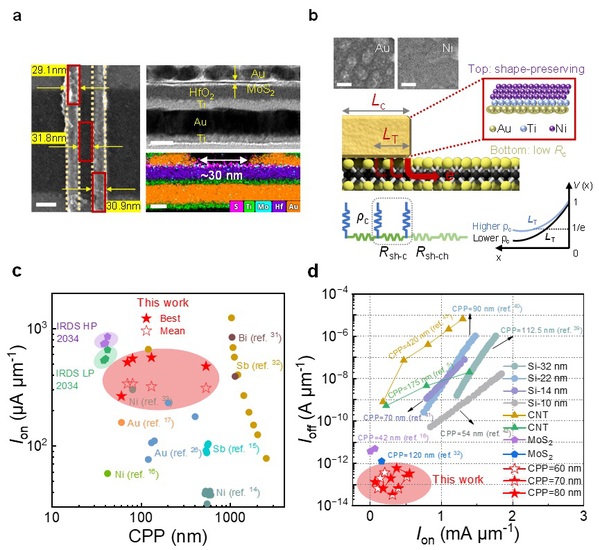 5月12日,微电子学院周鹏、王水源团队提出了一种兼具低接触电阻与保形作用的复合金属电极策略,突破二维晶体管接触长度微缩瓶颈,实现CPP全面微缩至60nm,不仅接近当前主流FinFET工艺的物理极限(TSMC N7节点CPP≈54nm),更获得了超节点性能,满足2034年国际器件与系统路线图(International Roadmap for Devices and Systems, IRDS)中先进晶体管的性能目标(0.7nm/A7节点)。相关成果以“Channel and contact length scaling of two-dimensional transistors using composite metal electrodes”为题发表于国际顶级期刊《自然-电子学》(Nature Electronics)。