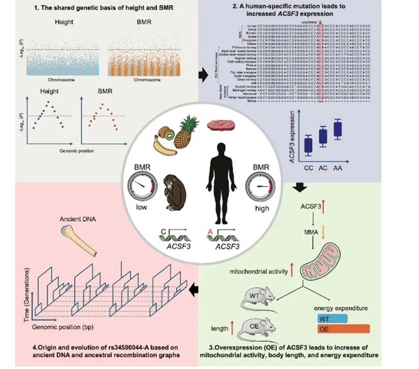 5月22日,人类表型组研究院樊少华研究员、李晋研究员和黄河研究员合作在Cell Genomics发表了题为“An ancient regulatory variant of ACSF3 influences the coevolution of increased human height and basal metabolic rate via metabolic homeostasis”的研究论文,揭示了人类身高与基础代谢率共进化的遗传基础。研究团队通过分析英国生物银行(UK Biobank)中约45万人的全基因组关联分析数据,发现了身高和基础代谢率具有显著的遗传正相关,并鉴定了超过6000个共同影响身高和基础代谢率的候选因果突变,分别占到身高和基础代谢率的候选因果突变的19%和29%。有趣的是,这6,000多个身高和基础代谢率所共享的候选因果突变中超过66%的突变携带人类特有突变。在这些突变中,作者发现了一个代谢酶ACSF3相关的人类特有突变rs34590044-A,携带该突变的人类具备更高的ACSF3表达水平、更高的身高和更高的基础代谢率。团队进一步发现,rs34590044-A突变起源于约65万年以前,不存在于26个非人灵长类动物基因组中。然而,该突变在现代人类多个群体中广泛存在,其频率在21%至66%之间。在古代欧洲人群中,该突变的频率受地域和人群迁移融合的影响。此外,在过去的2万年间,rs34590044-A突变受到微弱的正选择,并在约5000年前开始,正选择强度的显著增强。该研究揭示了在人类进化的过程中,遗传因素、环境因素、地域因素通过复杂的互作机制,形成了现代人类的关键生理学表型。除了遗传因素外,膳食的变化和人群的迁移,也对现代人类表型的形成存在重要影响。