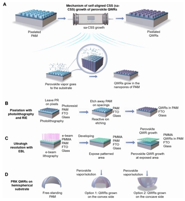 2. 未来信息学院/光电研究院张千鹏、吕华良、莫晓亮研究团队及其合作者开发了钙钛矿量子线的自对准紧密间距升华生长技术