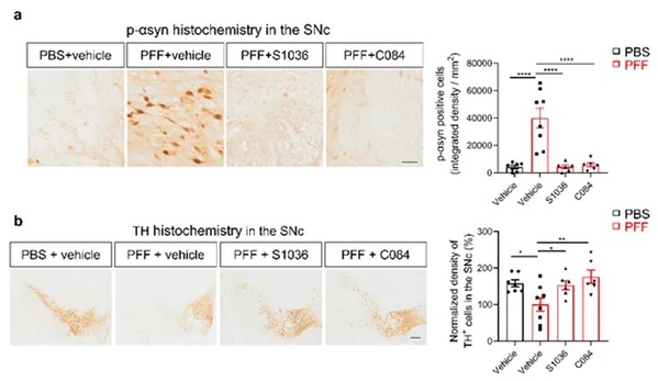 MEK1/2抑制剂显著降低小鼠黑质致密部中的p-αsyn水平和多巴胺能神经元死亡