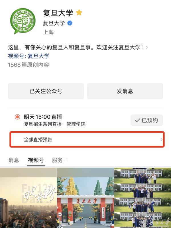 除复旦大学视频号、复旦大学微博,复旦招生视频号也将同步直播,可扫二维码关注账号,届时收看。