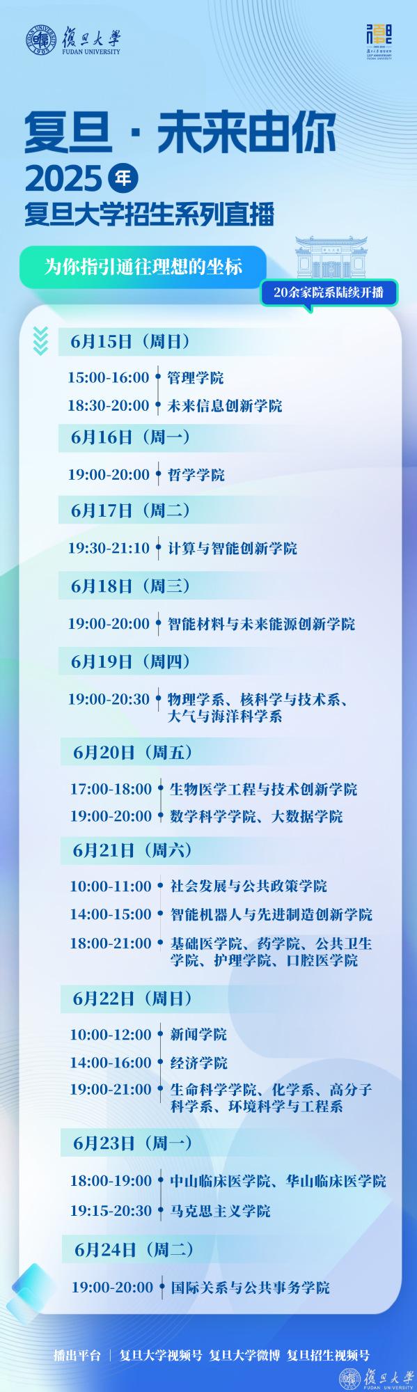 带着对未来的千万种想象,属于你的复旦故事正待启封。6月15日开始,“复旦·未来由你”2025年招生系列直播重磅开启!20余家院系陆续宣讲、覆盖文理医工四大学科板块,为你指引通往理想的坐标复旦“2+X+Y”培养体系。