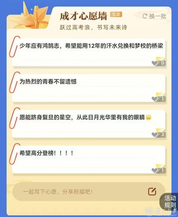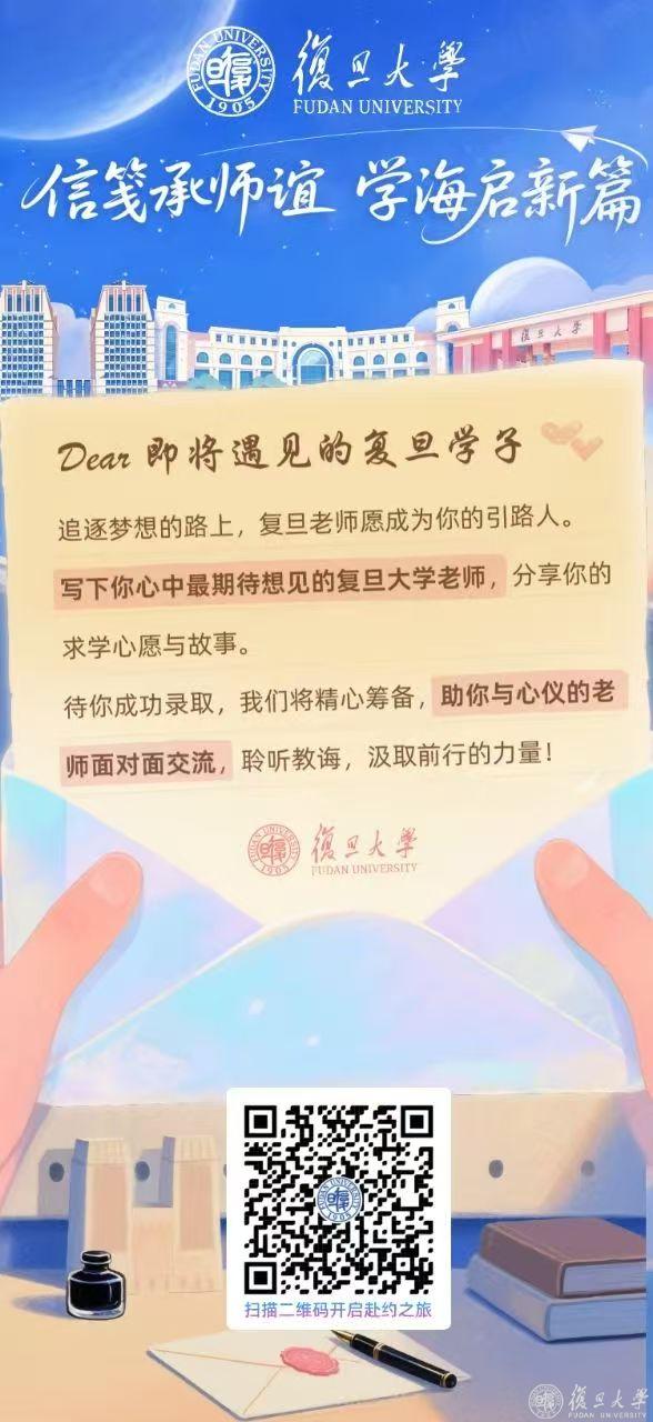 高考出分季,梦想引路人已在复旦等你!信笺承师谊,学海启新篇。此刻,复旦大学向你发出邀约:写下你最想见的复旦老师,许下专属成长心愿,待你成功录取,我们将为你牵线搭桥,开学即圆梦,与心仪老师面对面交流,汲取前行的力量!