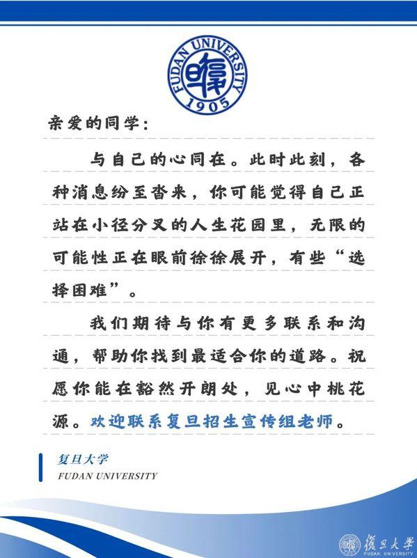从6月底开始,“复旦来信“与大家常伴。每封信开头的字眼连缀在一起,是“与百廿复旦共赴未来”的邀约。长期以来,复旦大学作为考生最心仪的高校,吸引了最优秀的生源。面对激烈竞争,部分考生未能通过本次选拔,希望大家坚定信心,不言放弃。我校在本科提前批、本科普通批同样投放了诸多招生计划,为同学们增加了录取机会。欢迎各位考生在不同录取批次乃至不同人生阶段,赴“旦”之约。