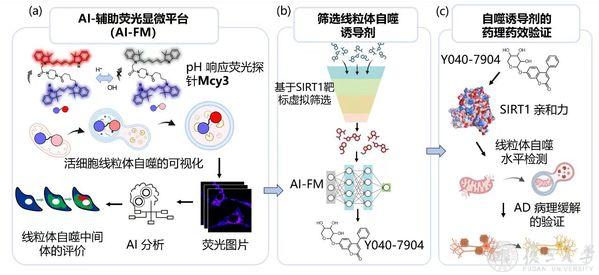 6月4日,药学院李聪教授、游艳青年研究员,信息科学与工程学院余锦华教授,以及云南大学药学院雷祖海教授联合研究团队在《自然-通讯》(Nature Communications)杂志发表题为“An AI-assisted fluorescence microscopic system for screening mitophagy inducers by simultaneous analysis of mitophagic intermediates”的研究论文。该工作开发了一种AI辅助荧光显微成像系统(AI-FM),用于活细胞线粒体自噬流的实时、动态、定量评估。AI-FM系统将具有线粒体靶向性的pH比率响应荧光探针Mcy3与深度学习模型有机结合,实现线粒体自噬中关键中间体的准确识别,并提供胞内各类中间体分布、密度、比例等定量信息,平均检测准确率高达86%。研究人员利用AI-FM系统筛选出一种新型线粒体自噬诱导剂Y040-7904。该化合物能够促进受损线粒体向自噬小体转运,并提高神经元线粒体自噬水平。在AD神经元细胞模型和AD线虫模型中,Y040-7904通过激活SIRT1/FoxO3信号通路,有效改善Aβ病理,展现出对AD潜在疗效。这项研究不仅为活细胞线粒体自噬的精准评估提供了新工具,也为神经退行性疾病的机制研究和药物筛选开辟了新路径。