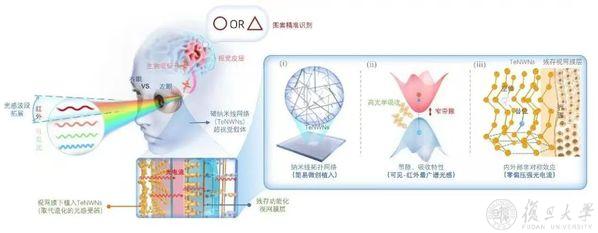 6月6日,集成电路与微纳电子创新学院周鹏/王水源团队、脑科学研究院张嘉漪/颜彪团队及其合作者以碲纳米线网络(TeNWNs)取代受损的光感受器,开发出全球首款覆盖可见光至近红外二区的超视觉假体。在没有外部电刺激的情况下,这种材料经过光照可以自发产生高密度光电流来激活残余的视网膜通路,达到不同维度纳米材料下的最高光电流水平,从而将视觉修复波段从可见光推进至近红外二区(470-1550nm),这也是目前国际上最广谱的视觉光感重建波段。相关成果以“Tellirium Nanowire Retinal Nanoprosthesis Improves Vision in Models of Blindness”为题发表于Science期刊上。