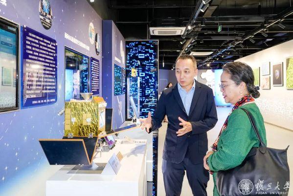 在“复旦源”科技馆,吉尔一行和阿里沙赫巴纳一行听取中国科学院院士、校长助理彭慧胜等专家介绍复旦大学人工智能进展,重点了解了MOSS大模型、AI for Science(AI4S)显微镜研究、以及人工智能在生物、医疗、气象等领域的应用等成果。