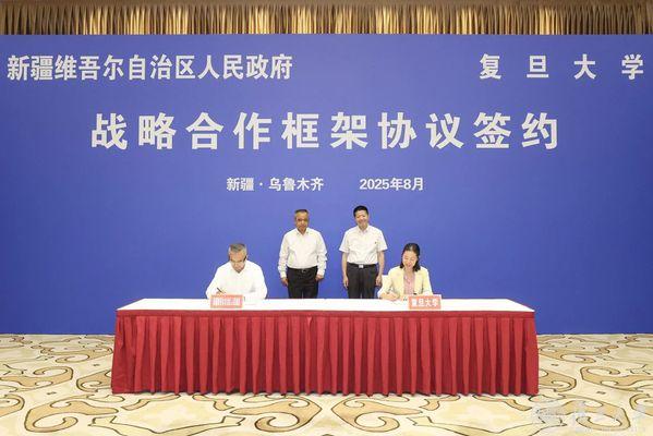 8月11日,新疆维吾尔自治区人民政府与复旦大学签订战略合作框架协议。在新疆维吾尔自治区党委副书记、自治区主席艾尔肯·吐尼亚孜,复旦大学党委书记裘新的共同见证下,自治区人民政府副主席凯赛尔·阿不都克热木与复旦大学党委常委、常务副校长许征代表双方签约。