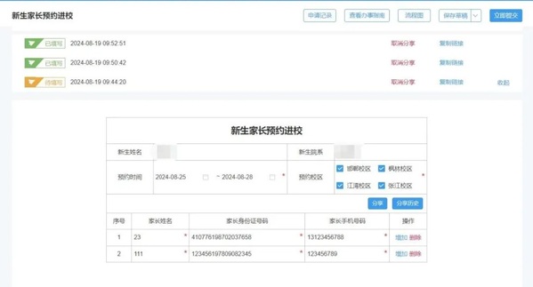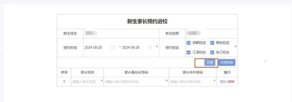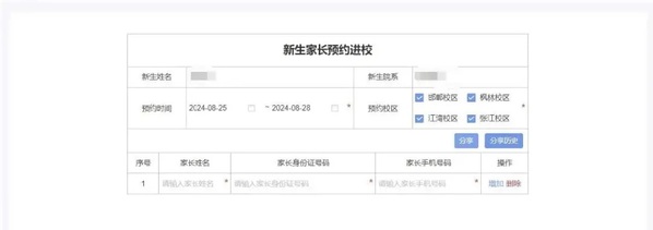 2、每位新生最多可以预约15位亲属进校,请按需预约,减少报到期间校园人流压力。
