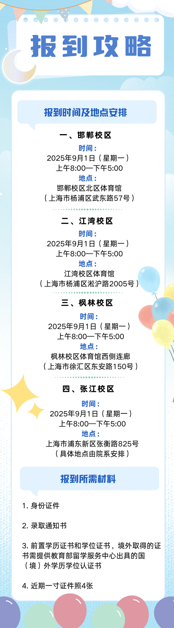亲爱的2025级新生,欢迎你们加入复旦大家庭。我们将在这片百年学府的土地上与来自世界各地的你们见面。这份超全的报到攻略是你与复旦故事的开篇,未来的日子里,愿每一位复旦人追逐理想,收获成长,让青春在旦复旦兮的时光里绽放光彩。