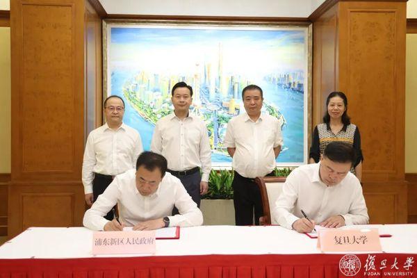 在中国科学院院士、复旦大学校长、上海医学院院长金力,上海市政府副秘书长、浦东新区区委副书记、区长吴金城,复旦大学党委常委、常务副校长许征,浦东新区区委副书记单少军的见证下,浦东新区副区长吕雪城与复旦大学上海医学院党委副书记杨伟国代表双方签署协议。