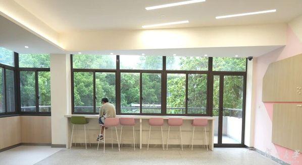 课堂之外,四教的每一处角落都藏着暖心巧思。每层均设公共休息区,倚靠窗边,绿意盎然,是自习与休憩的绝佳去处,常见同学们在此专注学习或课间小憩。