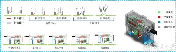 缝纫技艺是古代劳动人民智慧的深厚积淀,其传承与创新离不开广大手工技艺者的实践。在相关技术开发领域,齐立哲研究员指出了关键创新方向——“结构”与“行为”的融合仿生,通过深度借鉴并解析人类高超的操作行为,将隐性的经验与技艺转化为可建模、可复用的智能化作业技能。例如,在极具挑战的布料分层抓取任务中,团队通过分解人类操作流程,发现人手通过“捏、拱、滑、夹”等一系列精细动作完成抓取。基于此,团队创新提出仿人手指尖-指腹协同作业的布料分层抓取机械手。此外,缝纫过程本身也包含“对-调-检-送-缝”等复杂的手腿眼脑协同行为,团队在此基础之上,率先开展了立体协同缝纫技术的深入研究。经过多年持续攻关,团队在该领域积累了丰富的研发经验与丰硕成果,为后续技术转化奠定了坚实基础。