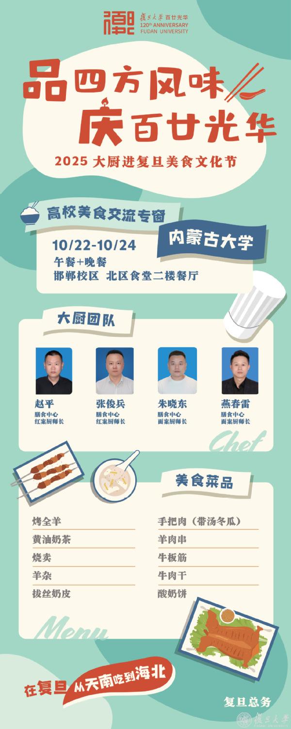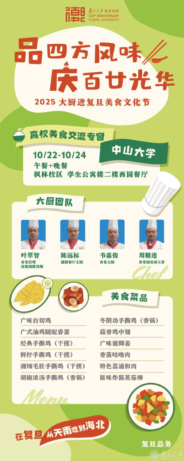 10月22日起至10月24日,品四方风味,庆百廿光华——2025“大厨进复旦”美食文化节高校交流专窗全面开放,将在午餐和晚餐时段持续供应美食,快来四校区食堂一站式尝遍天南海北。
