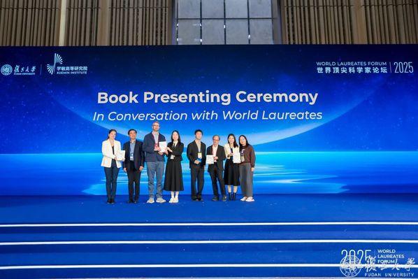 闭幕仪式上,人民日报出版社社长丁丁,复旦大学新闻学院教师伍静及研究生许子睿、胡佳妮,向顶尖科学家及青年科学家代表赠送了《走近世界顶尖科学家》一书。
