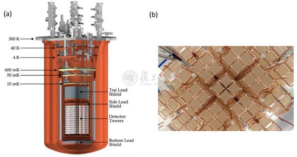 图(a) CUORE实验的低温恒温器示意图;图(b) 由19座晶体塔阵列组成的探测器(每座塔阵列由52块立方体晶体量热器单元构成)