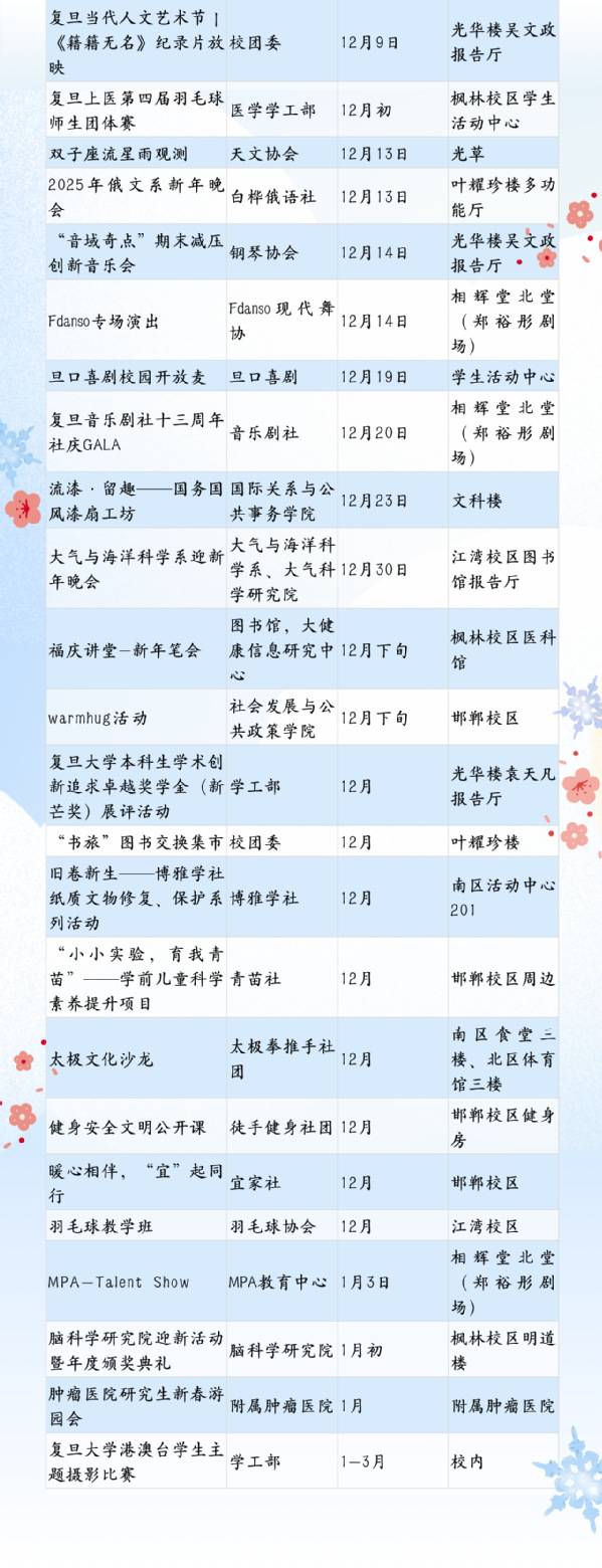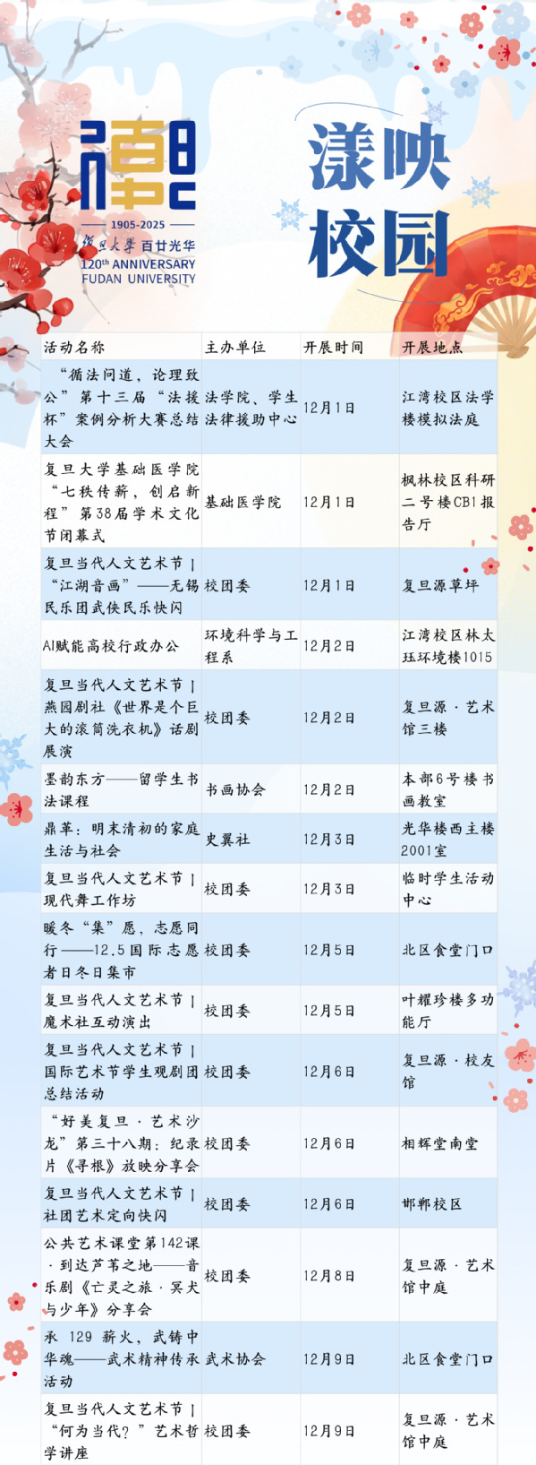 霜华染径,晴岚绕檐。十二月的复旦,迎来冬日。可听和声回响漫过相辉堂,可见绍兴越韵轻拂墨书香,星光与笑语撞响岁末,于此谱写新年的序章。不妨跟着文化校历,同赏校园冬日清欢。