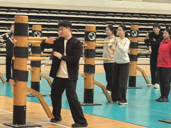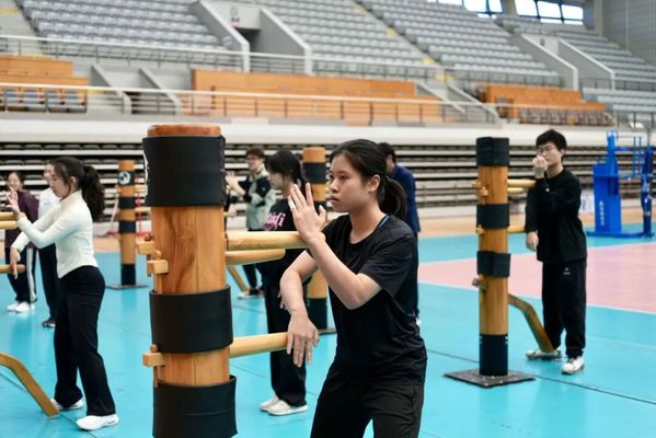 孔繁辉出身北派武术,系统掌握近十种传统拳械,却特意引入咏春这一南派代表,是“希望让学生了解传统武术的多元面貌和文化内涵。”课程设计遵循“理法并重,身心兼修”的理念,从二字箝羊马、摊手、膀手等基础架构,到“小念头”套路与黐手应对,层层递进地引导学生“筑基、明理、致用”。