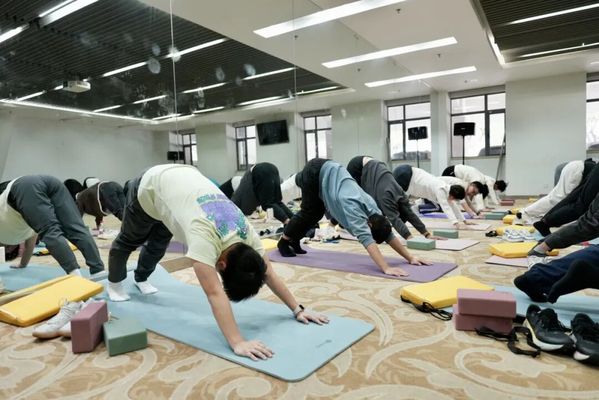 课程从呼吸调控、基础站姿入手,逐步推进至“拜日式”串联及各类前屈、后伸与扭转体式。每节课以调息静心开始,以“休息术”收尾,其间辅以清脆的引磬唤醒学生意识,形成“动——静——醒”的完整闭环。