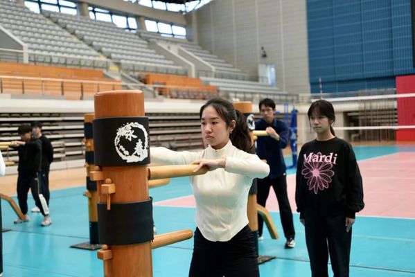 “我们不追求动作的高难度,更重规范与文化感知。”学期考核虽只有一段小套路和木人桩,教学中却融入了武德礼仪、传统哲学与发力原理的讲解。在唐海棠看来,这种慢进度反而适合入门。“它像一扇门,推开后能看见更广阔的天地。人体结构和发力原理是相通的,因此对空间位置的把控、对劲力的感知引导,是不同流派的必修课。”