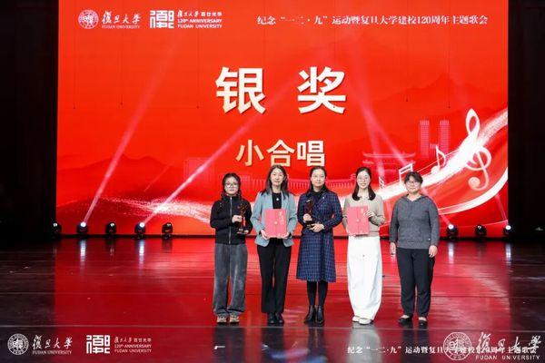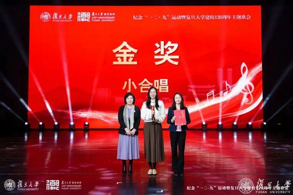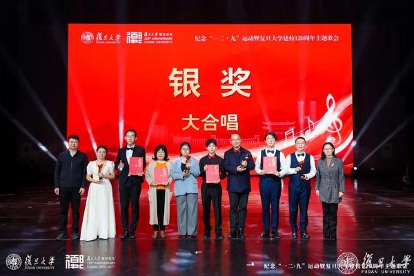 复旦大学教工合唱团的老师们一曲《祝“复”百廿,荣耀中华》,歌声交汇,曲律迭鸣,唱响跨越百廿的初心与深情。歌会最后,校领导、工会和团委各部门负责老师为歌会中获奖队伍颁奖。复旦大学党委副书记钱海红为荣获大合唱、小合唱金奖的队伍颁奖。在全场师生共唱《复旦大学校歌》的旋律声中,歌会落下帷幕。