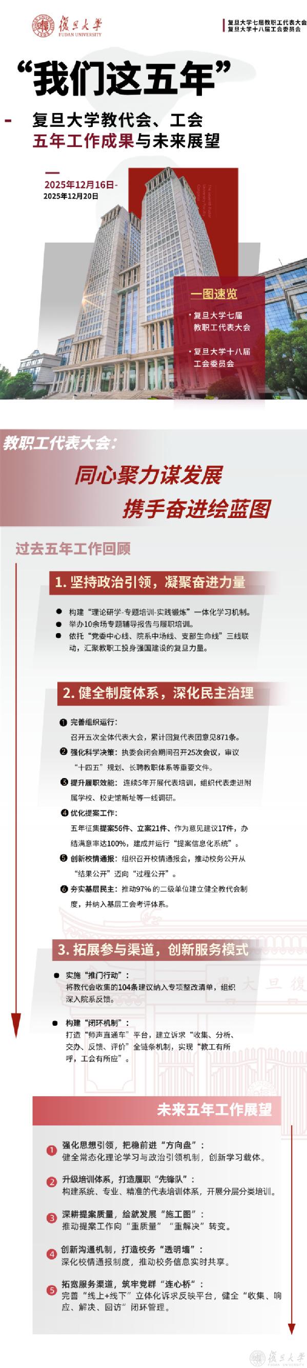 他表示,第七届教代会及执委会、第十八届工代会和工会履职尽责、担当作为,积极服务中心大局,坚持深化民主管理,着力解决民生难事,不断强化自身建设。学校党委对五年来教代会、工会的工作充分肯定。新征程上,全校各级教代会、工会组织要深入贯彻习近平总书记关于工人阶级和工会工作的重要论述,竭诚团结服务教职工,持续提高引领力、组织力、服务力,为建设“第一个复旦”贡献智慧力量。
