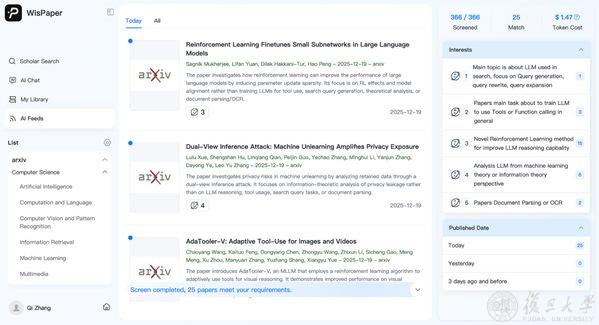 12月23日,在复旦大学自然语言处理实验室(FudanNLP)团队的努力下,其自主开发的AI智能科研助手WisPaper,面向复旦全体师生,提供免费Plus版本!