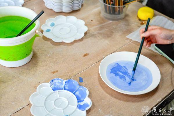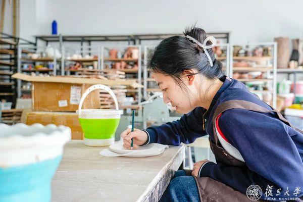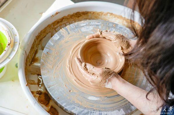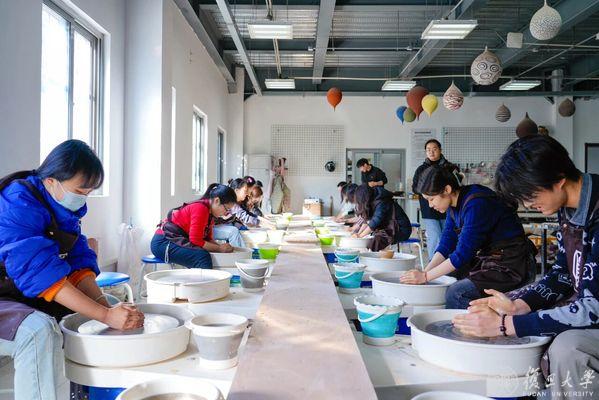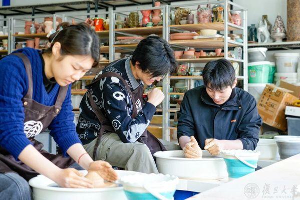 在邯郸校区北区陶艺教室,拉坯机的转轮嗡嗡低鸣,瓷土在湿润的指尖成形;条桌旁,师生们屏息悬腕,执笔蘸釉,在素坯上添上第一抹颜色。