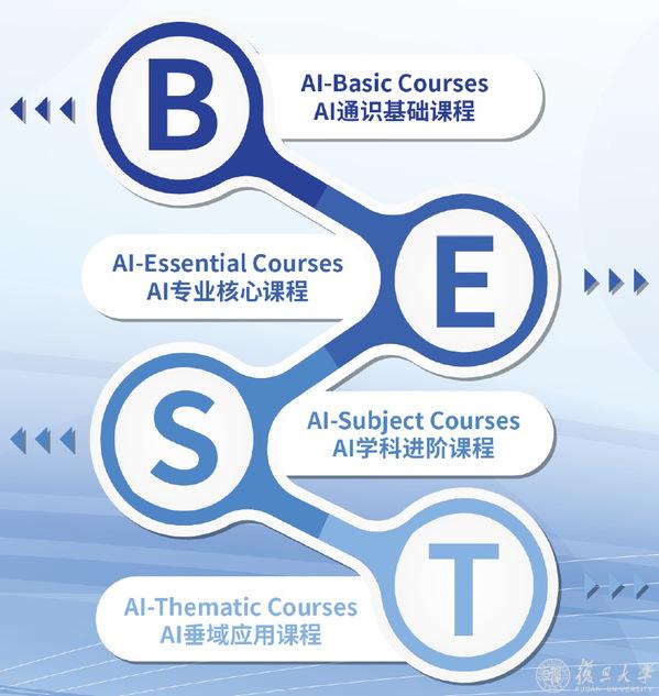 以AI-BEST课程体系为基座,学校通过分类组合课程群融通AI人才多元发展路径,创设了交叉人才培养的“复旦模式”。