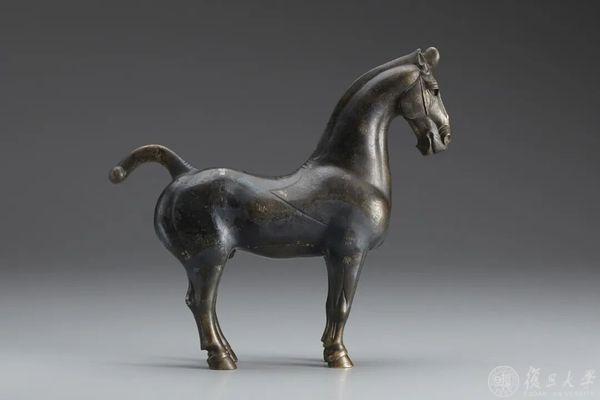 这件青铜马式,头尾长23厘米,体高13.3厘米,大致是按照秦汉良马十分之一的比例制作而成。据董珊先生考证,这件马式属于西汉武帝时期,其造型受到了汉武帝引进天马的影响,应该视为经天马改良后的汉马形象。