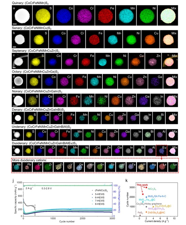 展示了制备的5-12元高熵金属硫化物和储钠性能以及与其他已报道的储钠正极材料性能对比