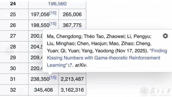 复旦大学、北京大学、上海科学智能研究院(以下简称“上智院”)组成的联合团队,通过自主研发的PackingStar强化学习系统,在12、13、14、17、20、21、25–31维等多个维度刷新亲吻数与广义亲吻数纪录,实现数学结构领域罕见的多维度、系统性突破。