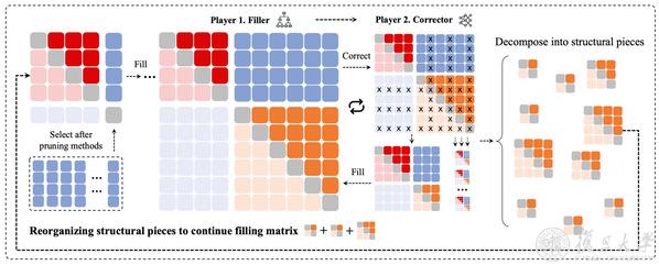 在合作博弈的框架下,这两个智能体共同探索如何更高效地进行矩阵填充游戏。每一轮游戏结束后,系统都会重新解构当前矩阵对应的几何结构,从庞杂的整体结构中提取出精炼的子结构,并将其用于下一轮游戏。通过这种“填充—修剪—解构—再填充”的协同机制,高维空间的探索难度被显著降低。原本高不可攀的数学难题被转化为一场有趣的“多智能体游戏”,并进一步成为可训练、可优化的人工智能任务。