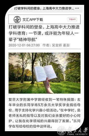 在复旦附中党委书记郭娟看来,作为大学附中,一方面要在学科教学上致力于培养学生的学术素养和创新能力,更重要的是,要立足立德树人,承担价值引领的使命和责任。