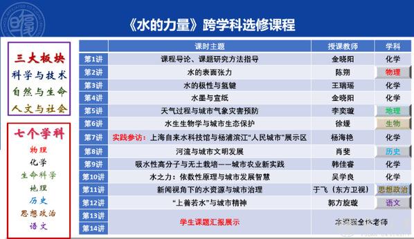 曾德琨退休后,金晓阳接手了这门课程,并继续改进、创新。将原先7课时拓展为14课时,打通更多学科领域,由12位教师共同参与教学,在理论探讨、实验探究之外,还组织学生参观上海自来水科技馆,每个学生小组还需要完成一项研究性课题,在结课时汇报展示。