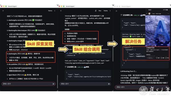 例如,你可以让GenericAgent从零学会发布小红书。当你发送“发一篇小红书”指令。初始状态下它没有小红书的操作工具。它自主访问DataHub,按“质量+安全”双重排序,下载了“小红书通用工具”、“爆款文案生成”和“图像自动化排版”三个Skills。Agent通过阅读这三个Skills在DataHub上的透明实现细节和接口文档,自动将它们串联,成功发送了图文并茂的小红书帖子。