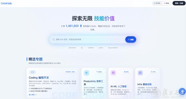 今天,复旦大学计算与智能创新学院肖仰华团队于DataHub平台正式上线百万级Skills资源库。作为国内高校最早的“龙虾”相关成果之一,其汇聚全球140万+高质量AI技能,搭载先进AI推荐引擎,帮助用户在海量数据中精准定位,释放智能潜力。