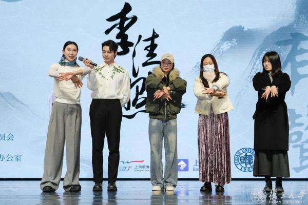 现场,两位演员亲身示范“小舞花”动作,并邀请观众共同参与。台下师生纷纷伸出双手,模仿演员动作,仿佛有一瞬间,也直观感受到了赵李二人的深切情感。