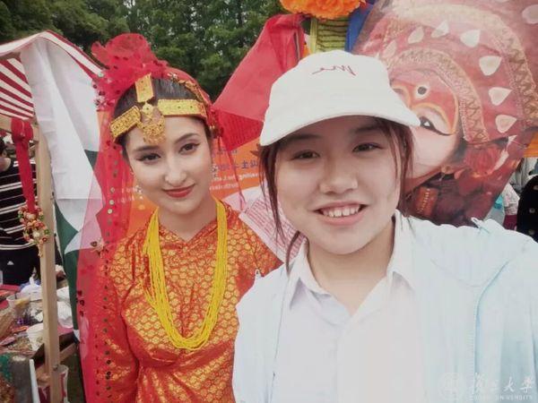 一次负责对接世界文化风情展时,付晓晴发现尼泊尔摊位只有一名同学,这意味着她需要独自将笨重繁多的物资从北区学生公寓搬到旦苑食堂前草坪。“我觉得还是得去帮忙”,付晓晴与她合力搬运完物资后,这名留学生笑着在她的眉心贴上一个红点,告诉她,这在尼泊尔象征着幸运,点上后一整年都会好运常伴。那一刻,付晓晴感到既荣幸又温暖,也更加体会到跨文化交流的魅力。
